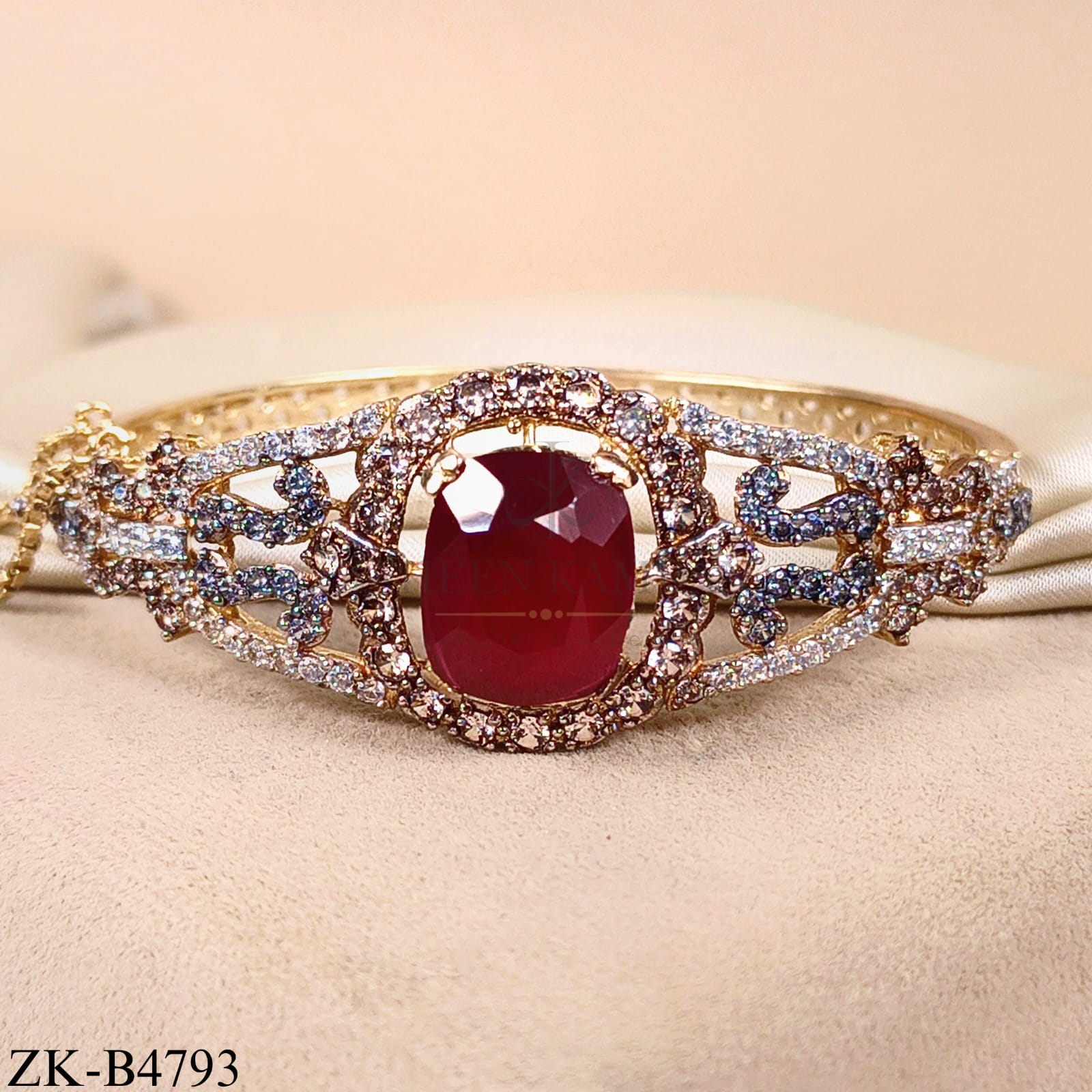 A luxurious gold bangle featuring a stunning oval red gemstone at its center, surrounded by zirconia.