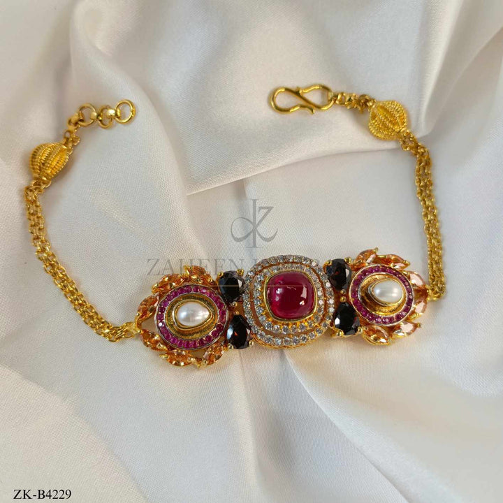 Handcrafted 22k gold plated bracelet studded with ruby, coffee stones and zircons.