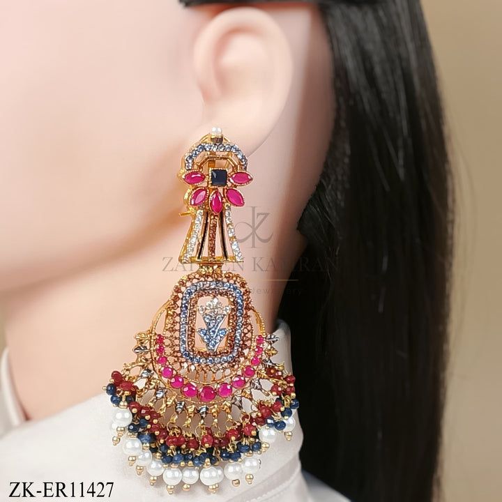 Handcrafted 22k gold plated earrings studded with ruby, sapphire, smoky and coffee stones.
