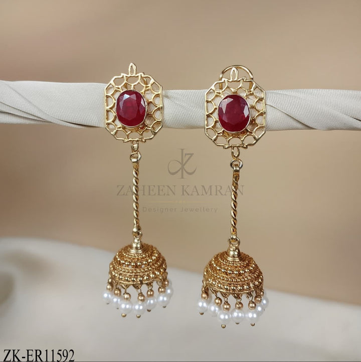 Handcrafted 22k gold plated earrings adorned with ruby and pearls.
