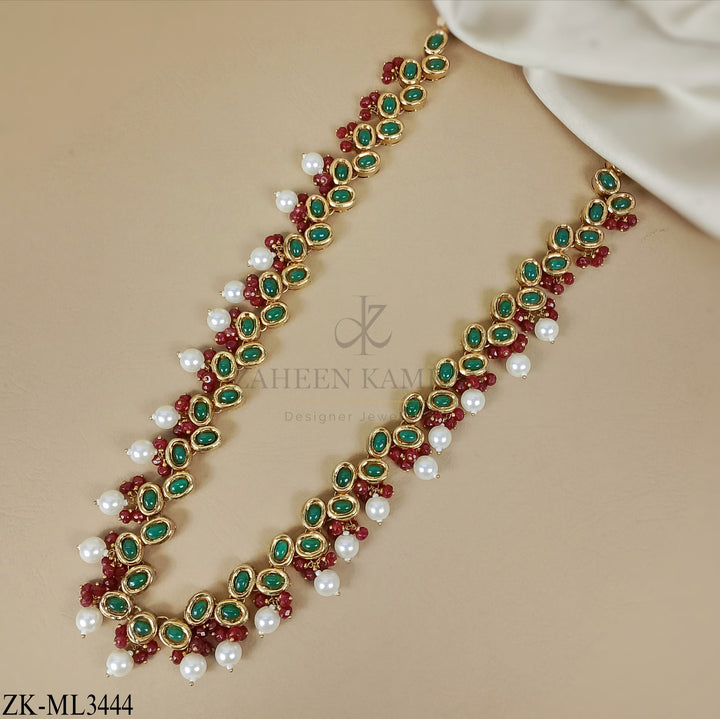 Handcrafted 22k gold plated mala studded with ruby, emerald and pearls.