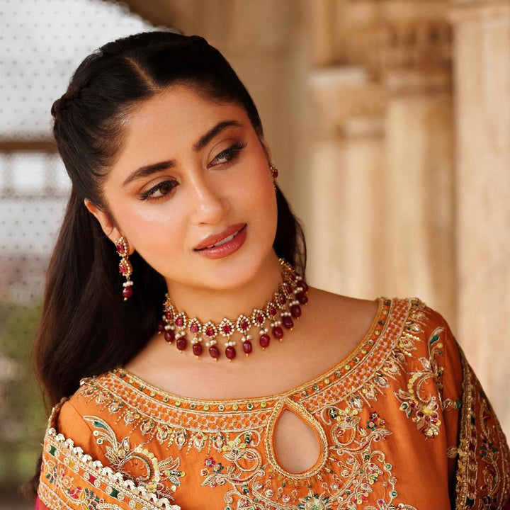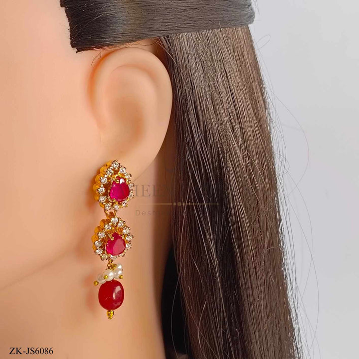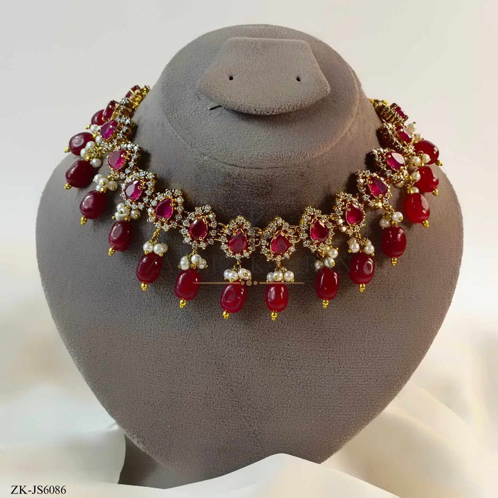 Handcrafted 22k gold plated necklace alongside earrings and tikka studded with ruby, zircons and pearls.