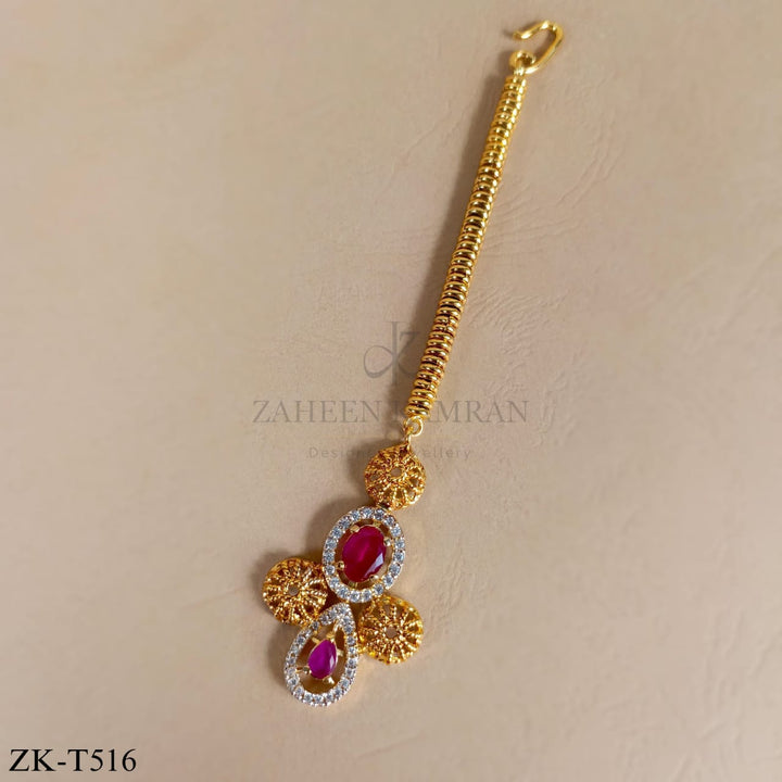 Handcrafted 22k gold plated tikka studded with ruby and zircons.
