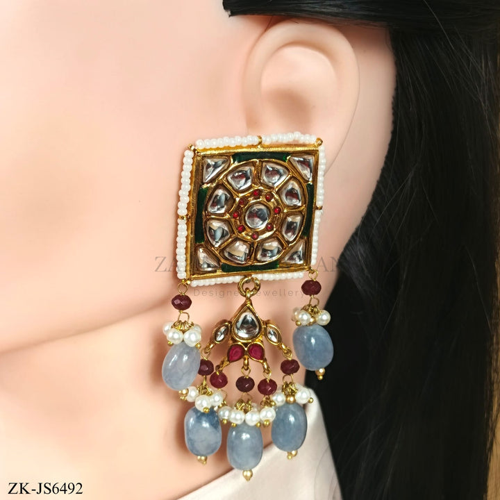 Handcrafted 22k gold plated choker alongside earrings studded with sapphire, kundan, green meena and pearls.