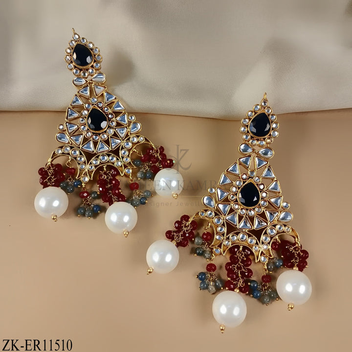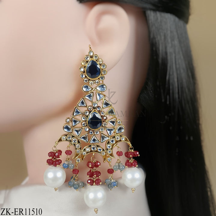 Handcrafted 22k gold plated earrings adorned with garnet, sapphire, kundan and pearls.