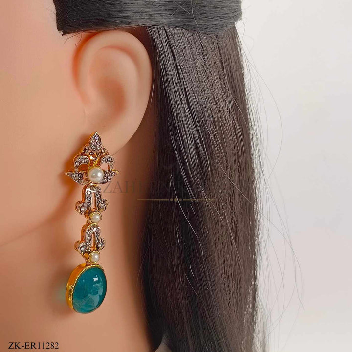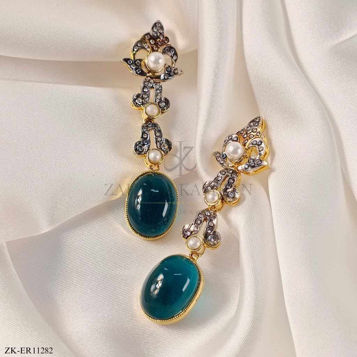 Handcrafted 22k gold plated earrings studded with sapphire, zircons and pearls.