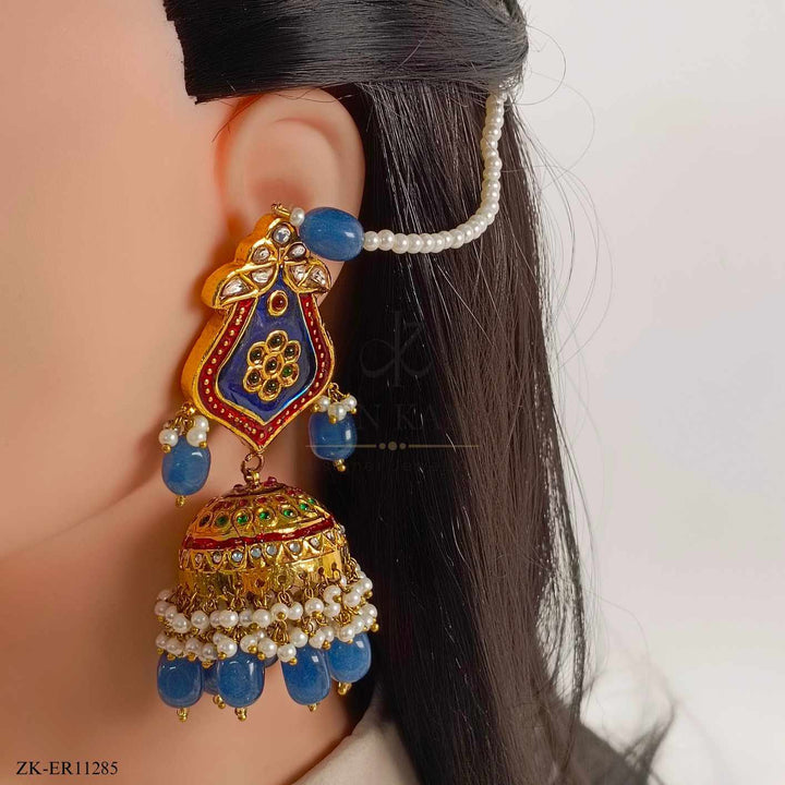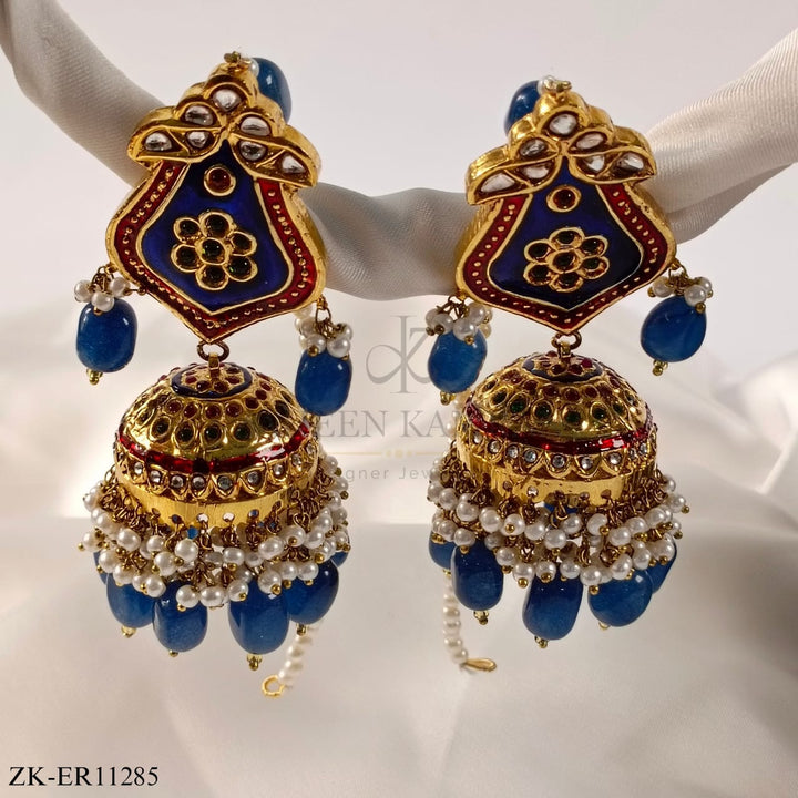Handcrafted 22k gold plated earrings studded with sapphire, pearls and blue meena.