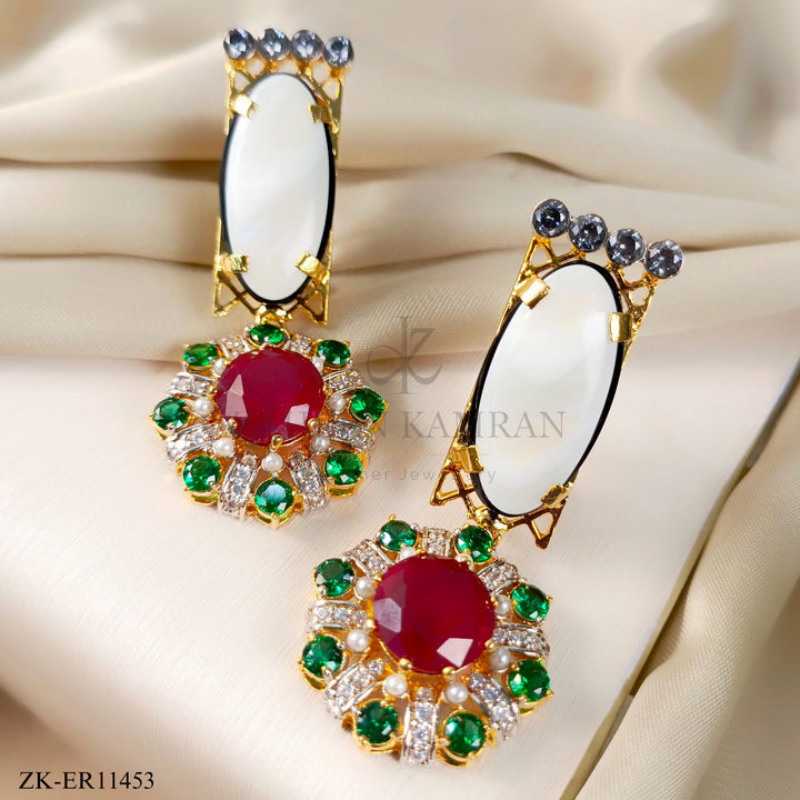 Handcrafted 22k gold plated earrings studded with white opals, ruby and emerald.