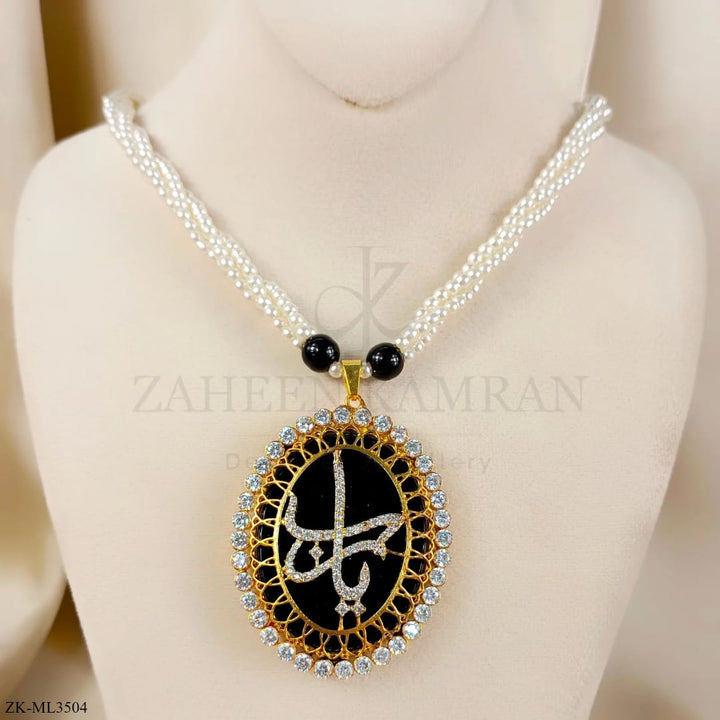 Handcrafted 22k gold plated mala studded with sapphire, zircons and pearls.