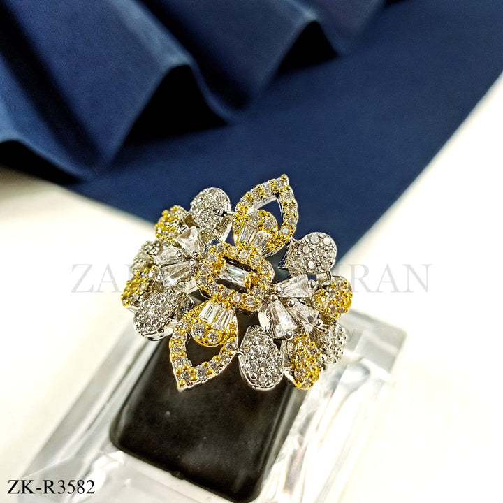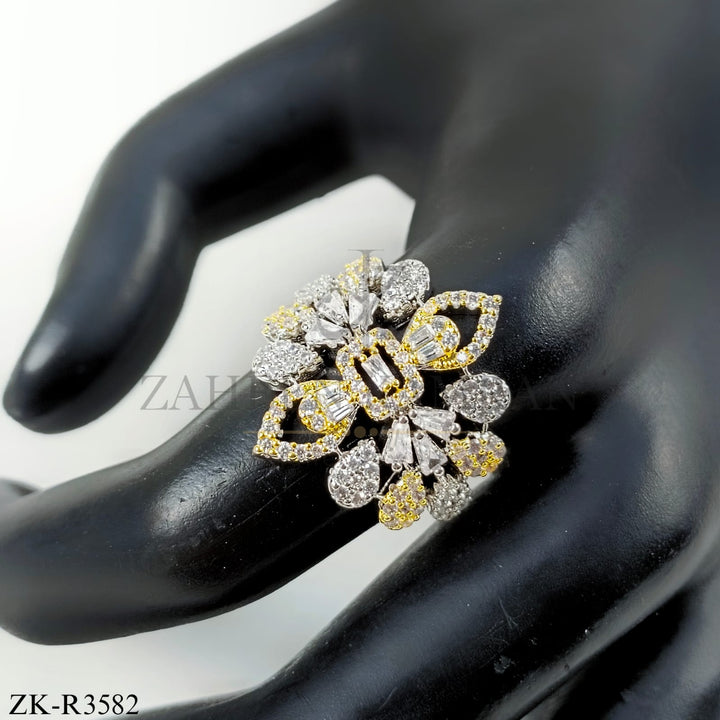 Handcrafted 22k gold and silver plated ring studded with zircons and cut stones.