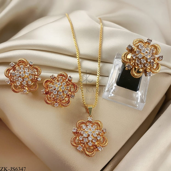 Handcrafted 22k gold plated pendant alongside earrings and ring studded with zircons.